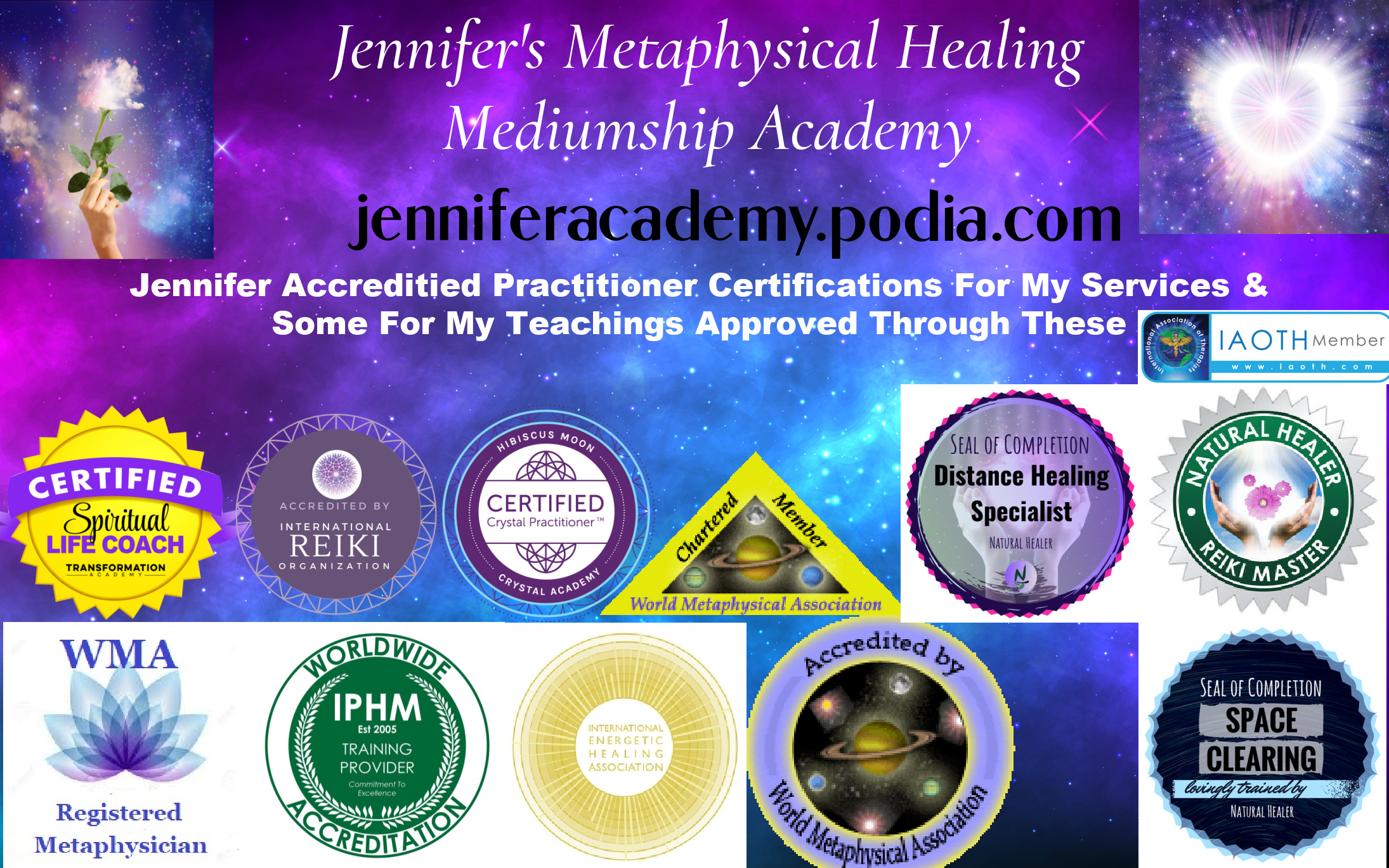 Iβm Jennifer, I am accredited and certified through esteemed organizations like WMA (World Metaphysical Association), IPHM, IAOTH, and IEHA. I bring a wealth of knowledge and wisdom in Metaphysics and Energy Healing Modalities, ready to guide you through your transformational journey. With our guides. π